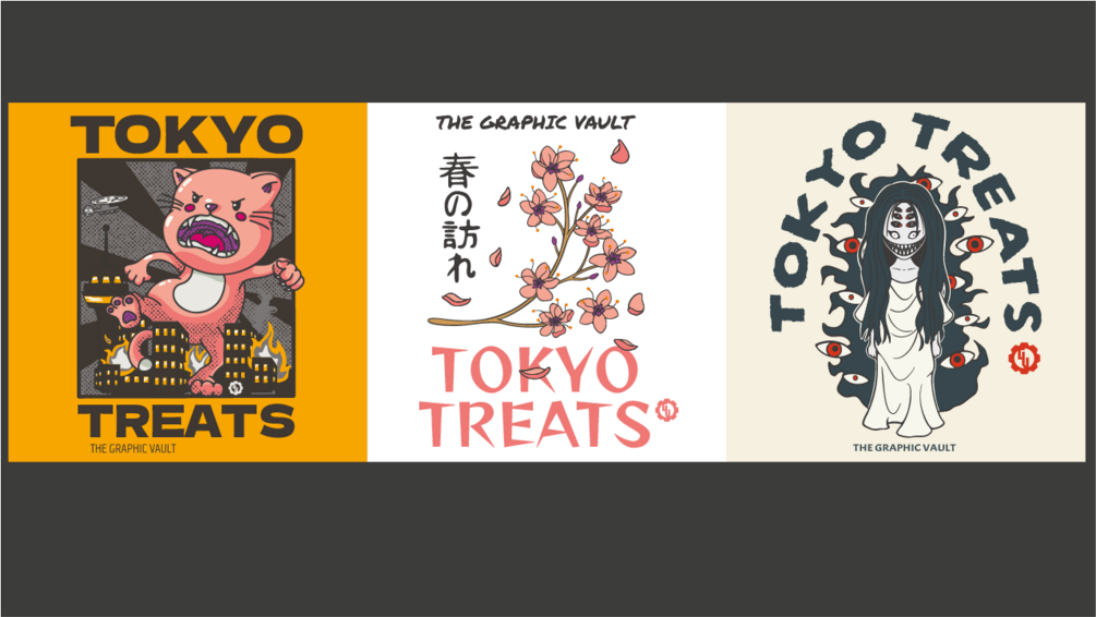 Treat your projects with TOKYO TREATS, a brand new set of graphic design templates. Inspired by japanese art, culture and folklore, this set of hand drawn illustrations will help you elevate your design work to new heights.
